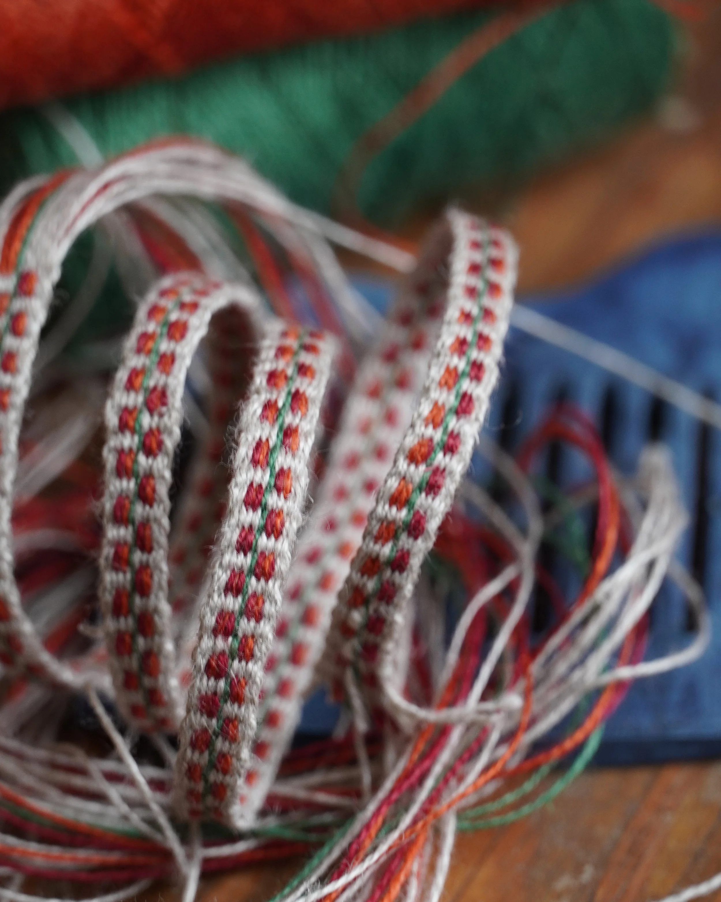 The weft is also intended to give the band extra bulk, and I have woven it in the “thick+thin“ style with two wefts, one thick consisting of 6 threads of yarn and one thin, consisting of only two threads.