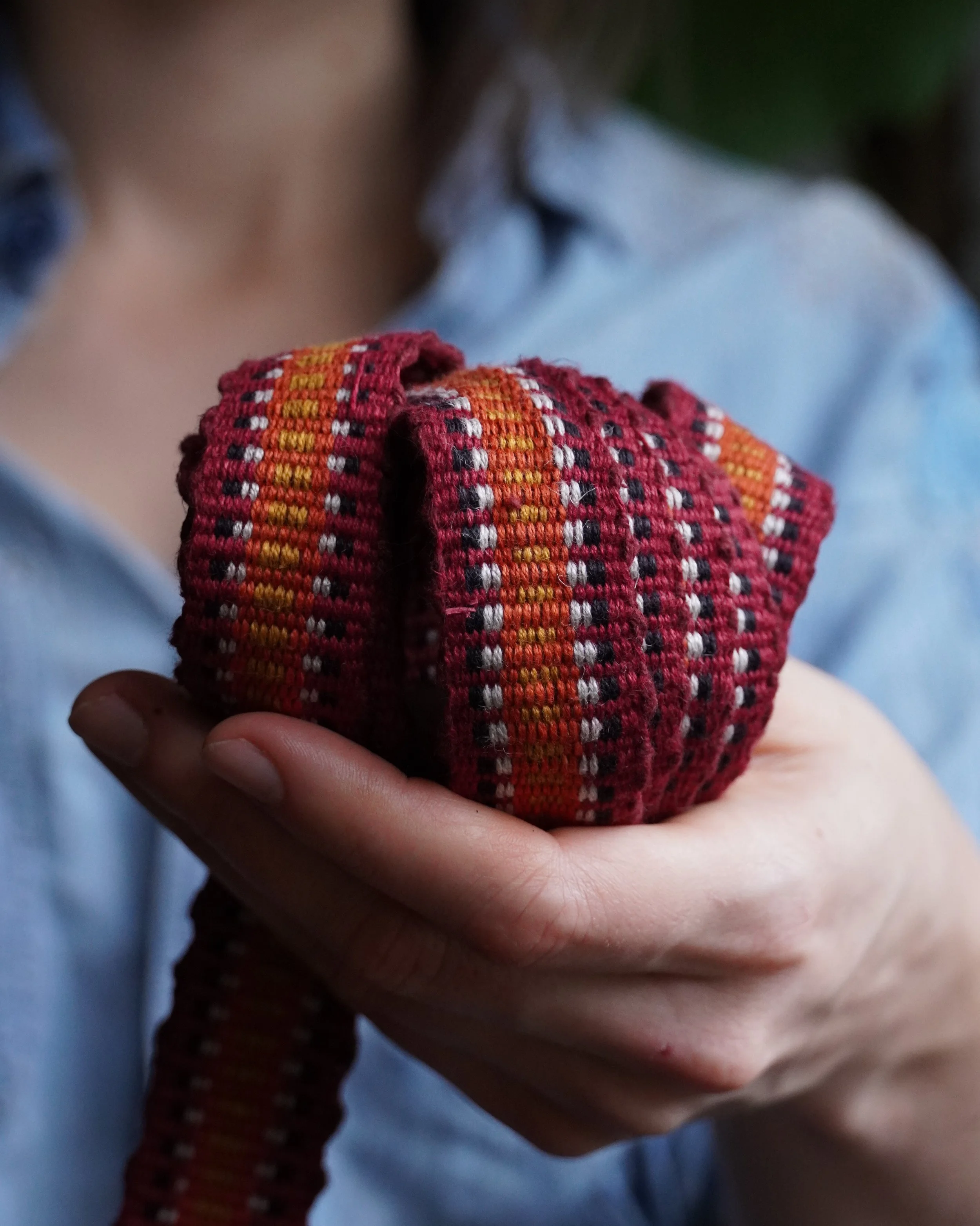 The red threads in the band are wool yarn. You can also use cotton or linen for the pattern threads but then you should use 3 or 4 strands together, as they need to be thicker than the white “background“ threads.
