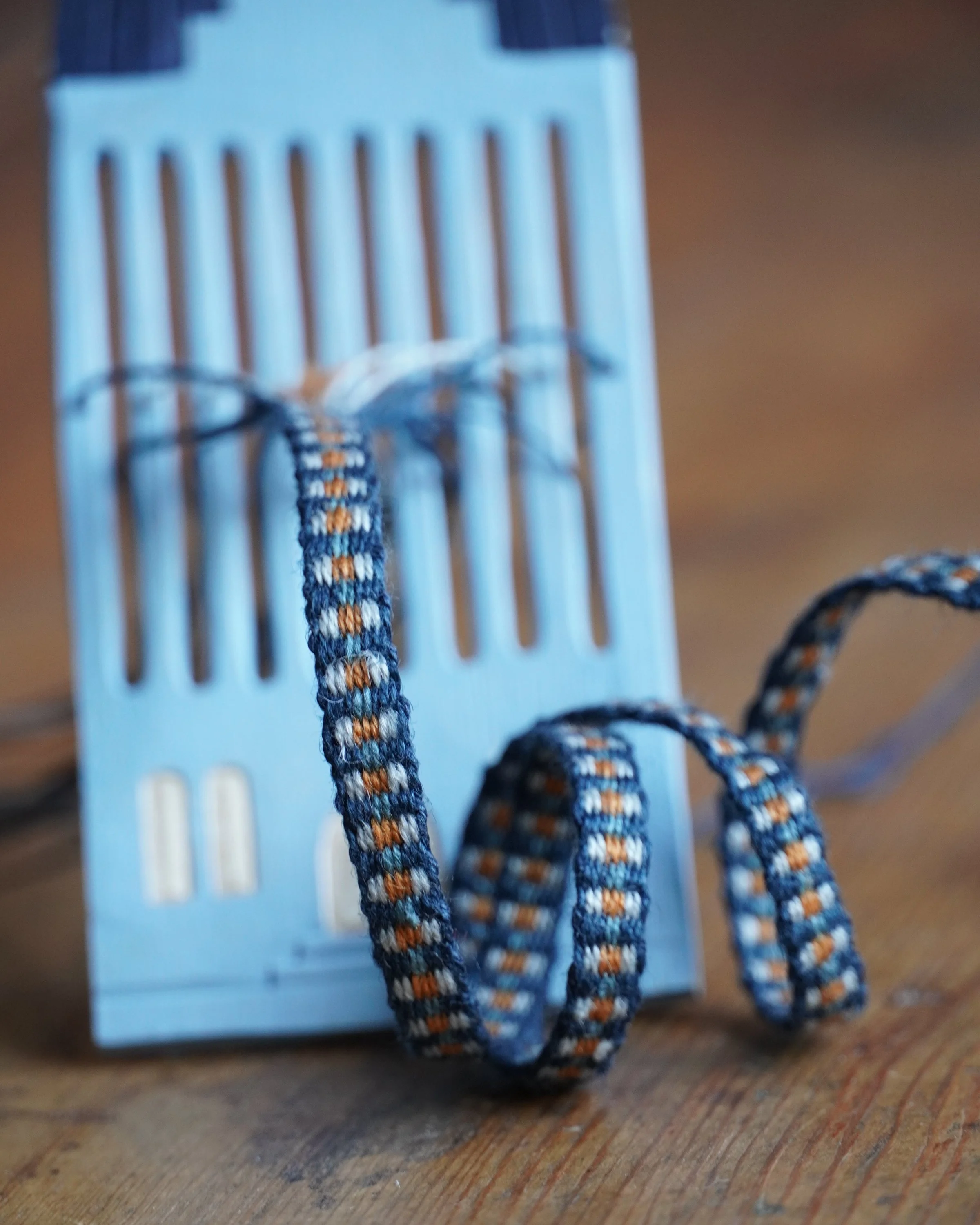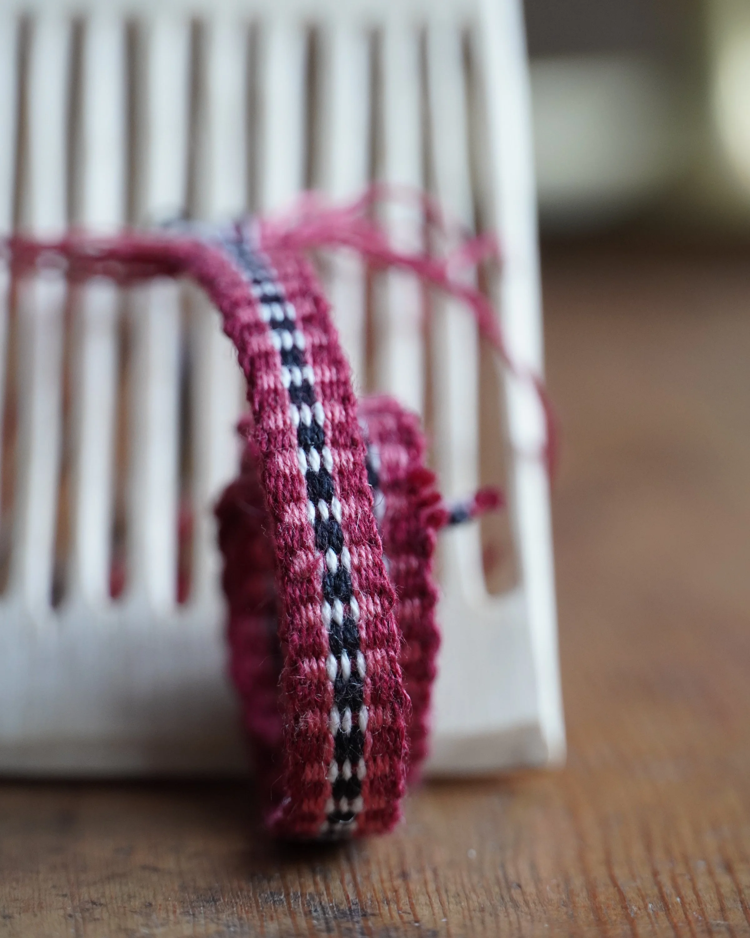 The “mouse hop“ pattern is a slim, double dot band that I first wove after seeing a similar one used in a 1800’s farmwife cap at an antique fair. This band is an elaboration on it, with pink beaming out to the sides: I was honestly not thinking of raspberries when drawing the pattern but when searching for a name it felt cute. Raspberry mouse hop. Like it could also be the name of a jig or a reel, played on a fiddle…