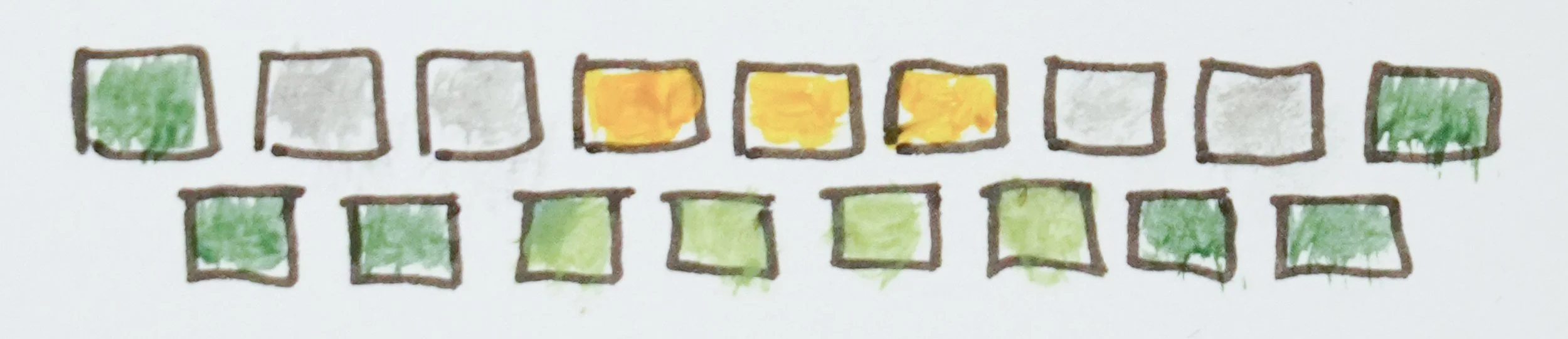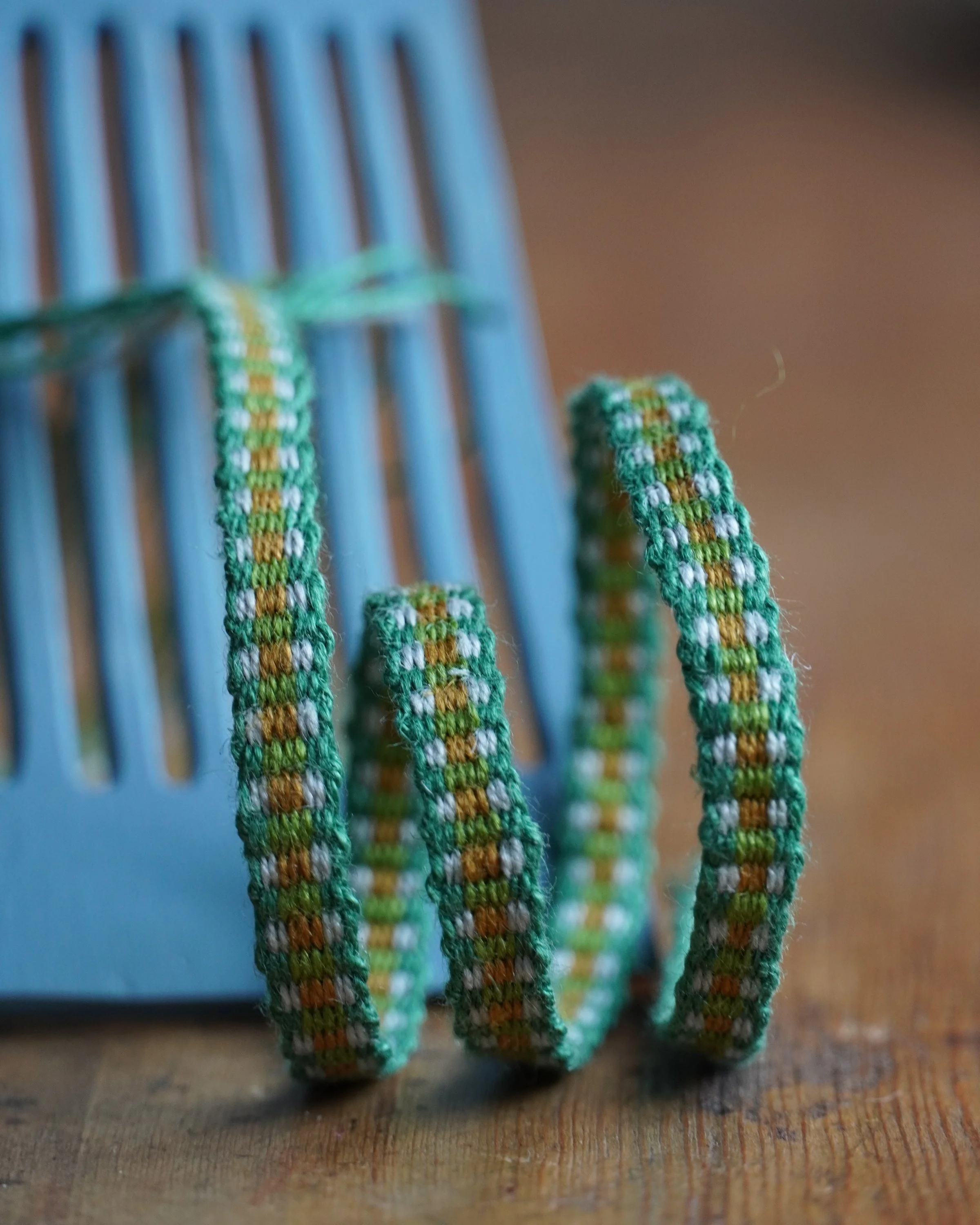 I’ve made one new band pattern and two variations on an old favorite and I’d like to share them with you! All of them are woven with the linen weaving yarn I sell in the webshop. The threading charts are in the same style as the band patterns in my book Simple Weave, where you can also find the mouse hop band I allude to below.