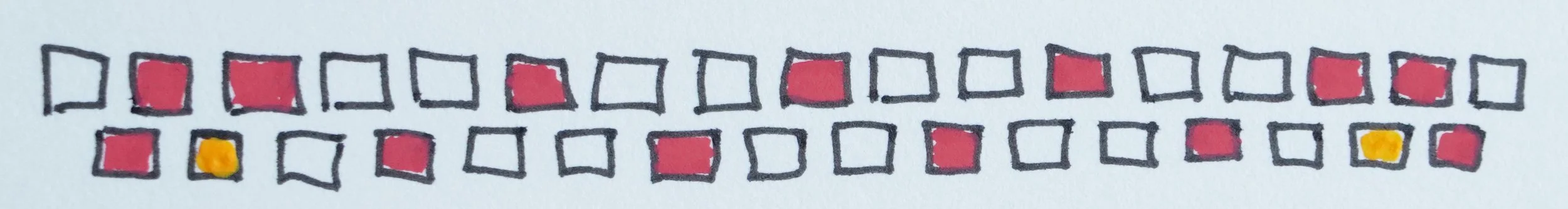 Typically, when speaking about pickup patterned bands, a colored square will indicate a pattern thread, and each pattern thread will be represented by a vertical row in the pickup chart like the one below.