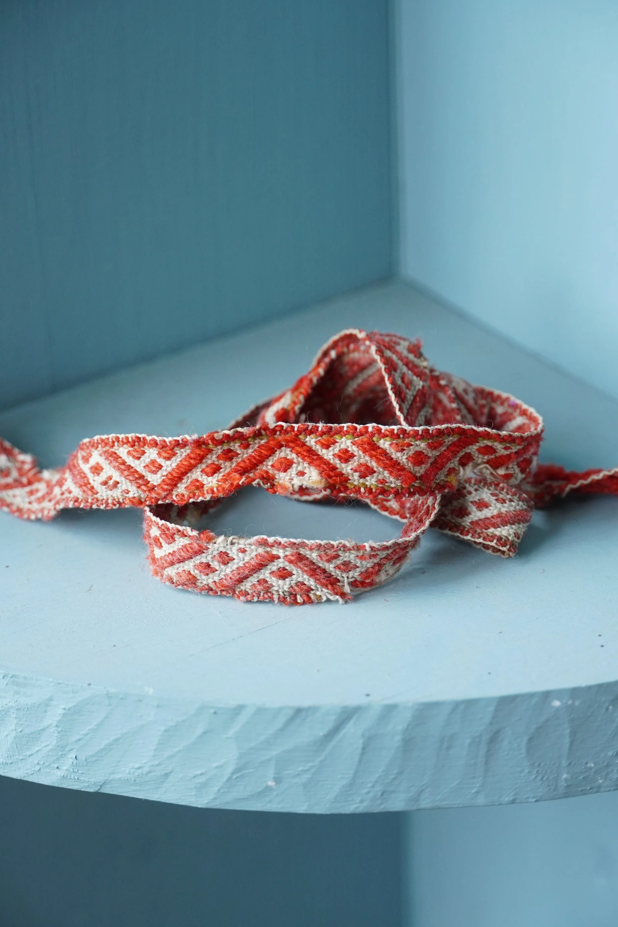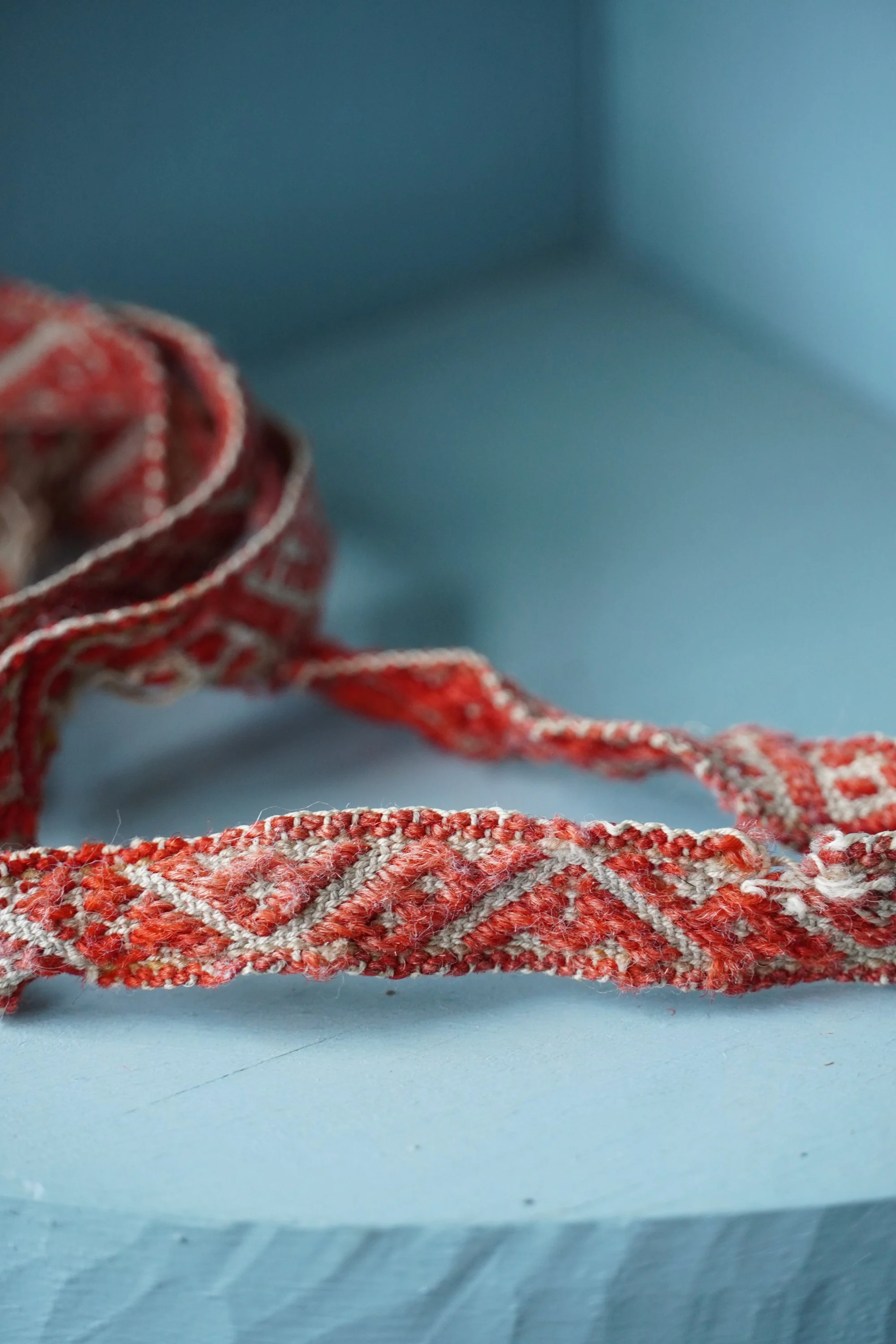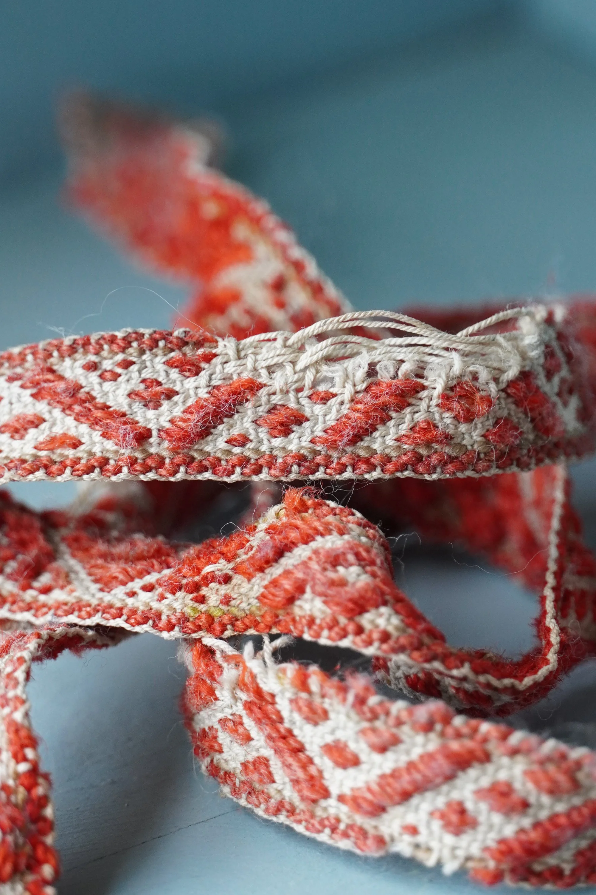 A while ago I was gifted a band by a friend who had bought a withy, which is a branch that had been twisted into a ring to be used as a latch (or holding things together) in a rural setting. The band was tied to the withy and has probably started its life as an accessory, but as it got worn with time it was degraded to a practical function like closing a gate. The use of withies was supplemented by manufactured items during the industrialization, and so the fibers of the band in combination with the fact that it was tied to a withy makes me guess that it should be dated to pre industrialization but post generalized import of cotton yarn. That places us around 1890-1920, in a rough guesstimate. The yarn used is a red wool yarn, spun by either machine or hand and a thinner white cotton yarn, most probably spun by machine.