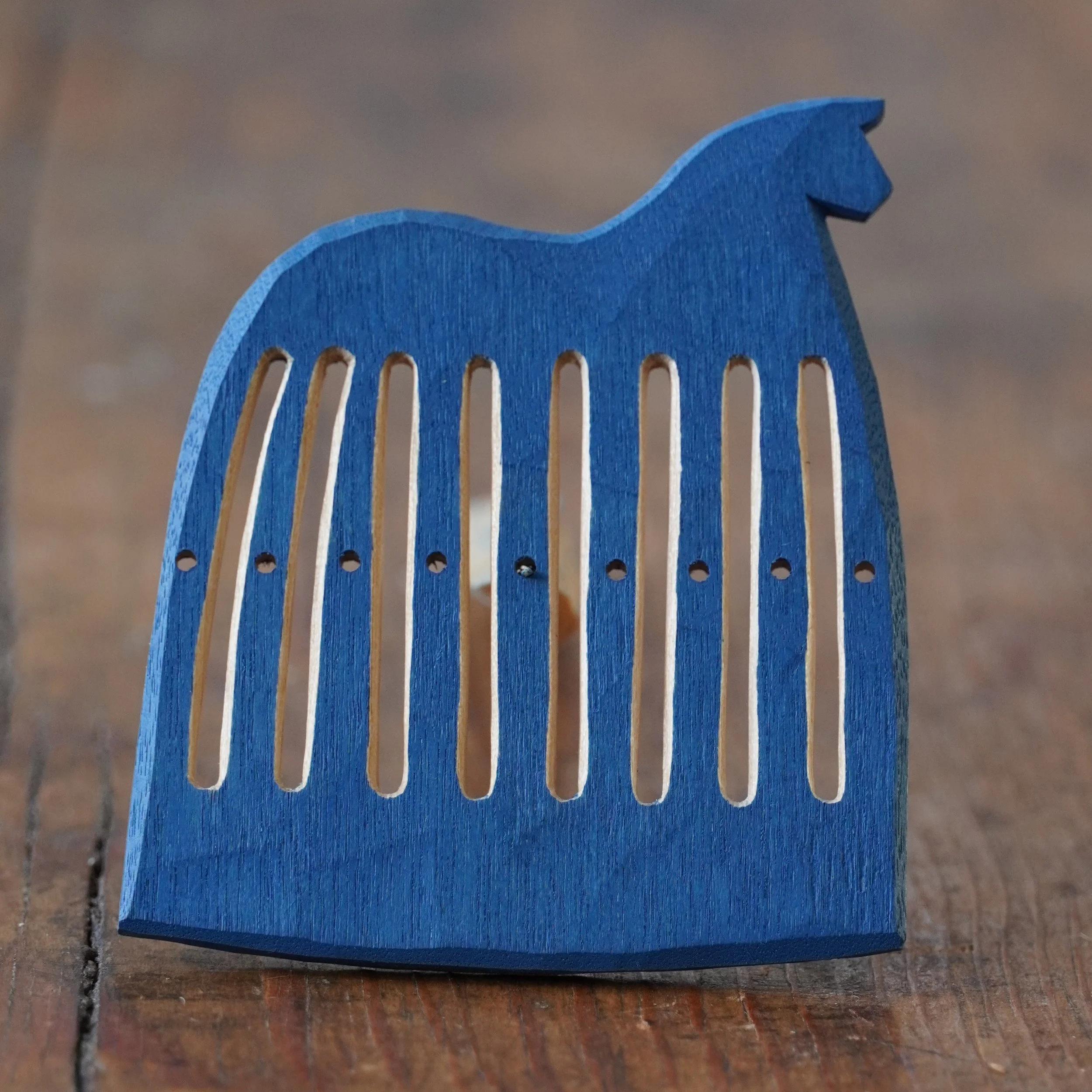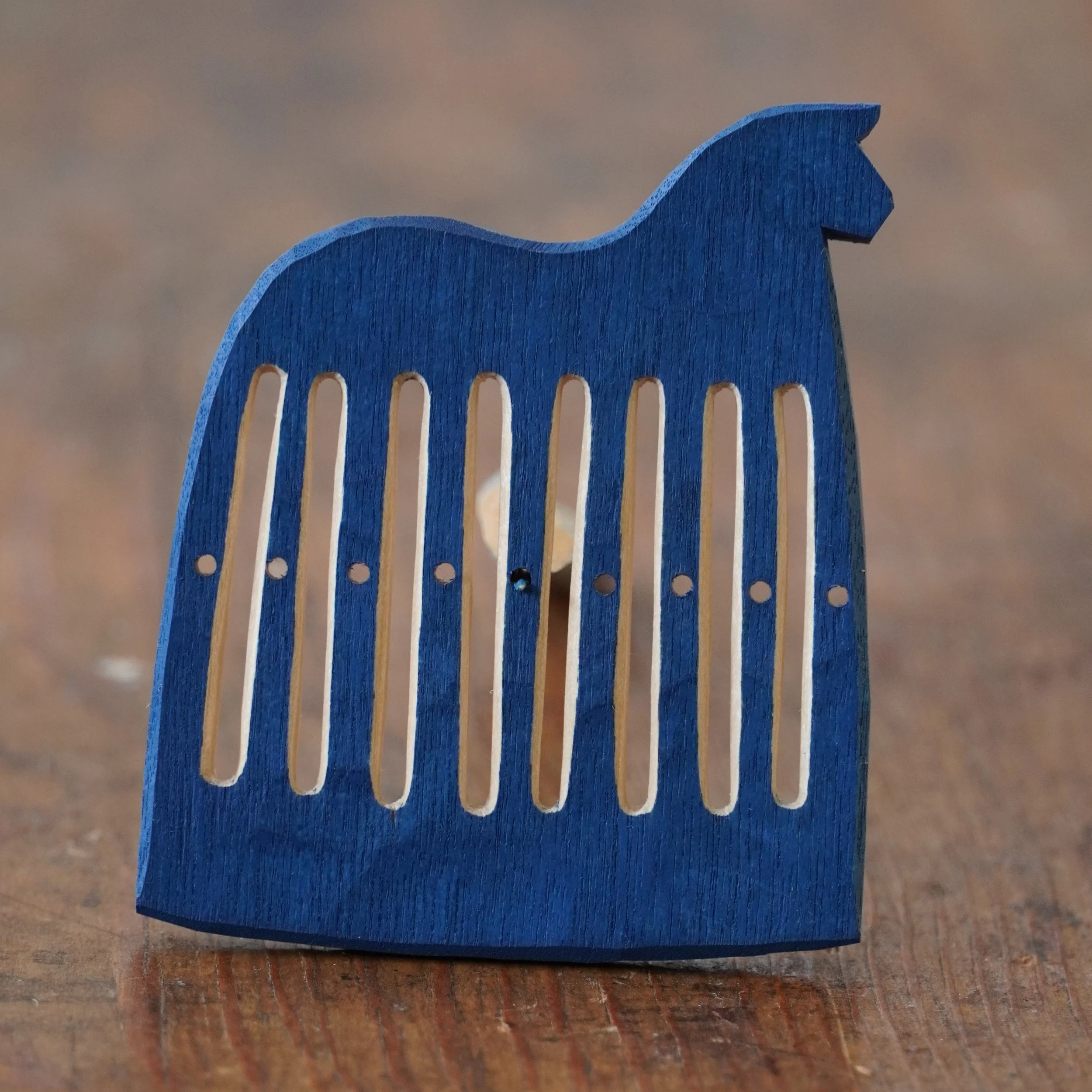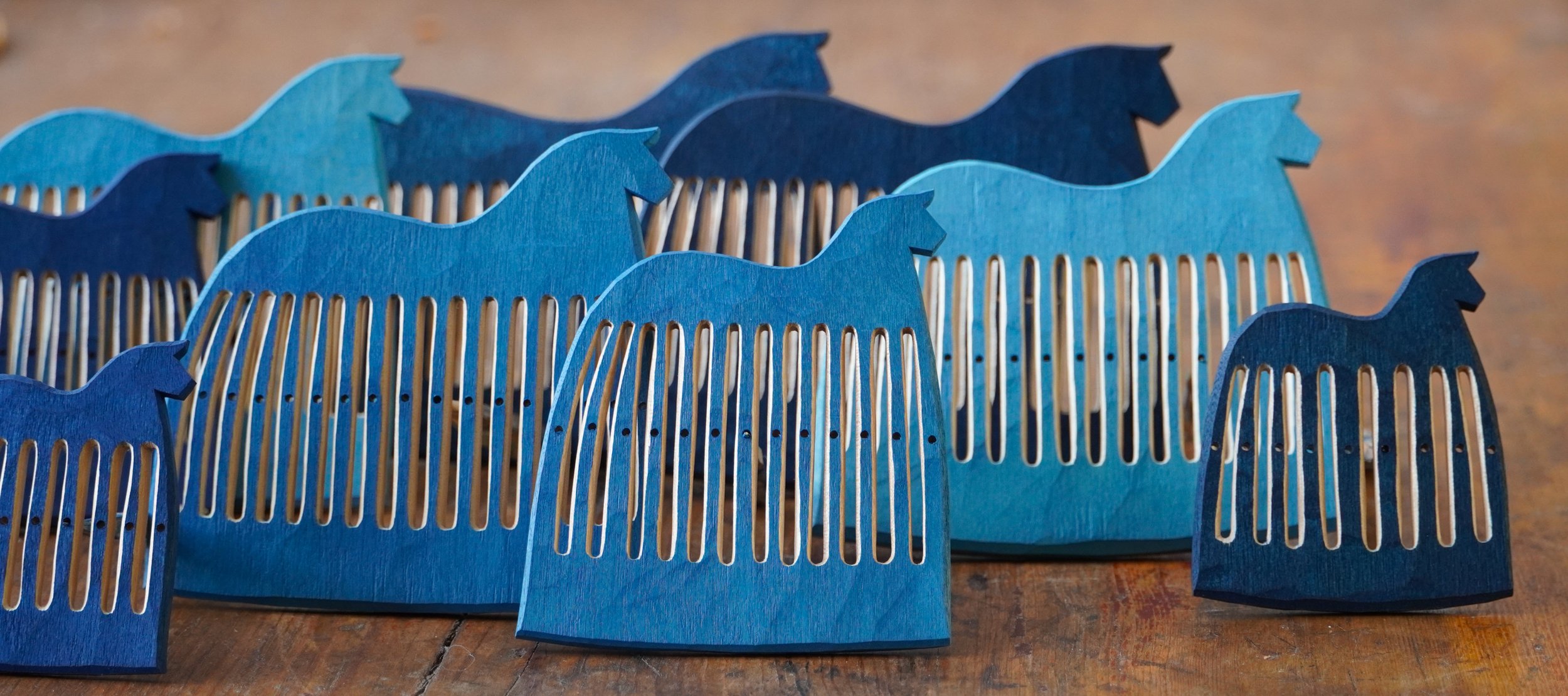 It’s February and that means blue horse heddles! Last year I did a couple of horses that had their slits carved through the painted surface, leaving the slits unpainted. This requires very high concentration as you’re carving the slits, as any mistake will show up as a dent in the paint, but I also love the feeling of the knife cutting through the cured oil paint. It has a sense of performance: A “now-or-never“ moment. I decided to make the full set of horses in this style and I really enjoyed it, even if my first idea that it would be faster to make a set like this because the painting is much faster turned out to be all wrong: When every cut shows, carving is a lot slower. But now, at last, they are done and ready for you!
