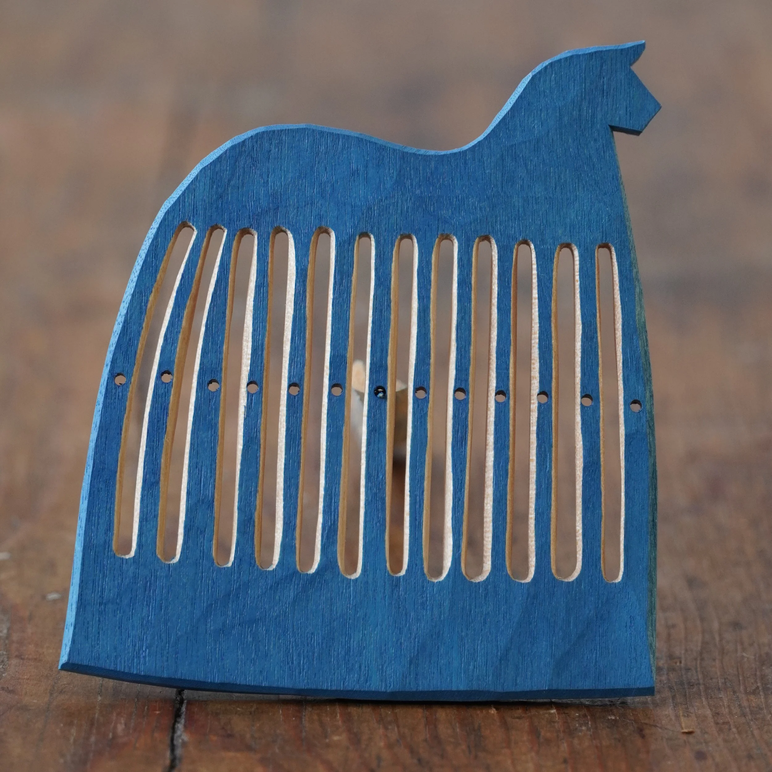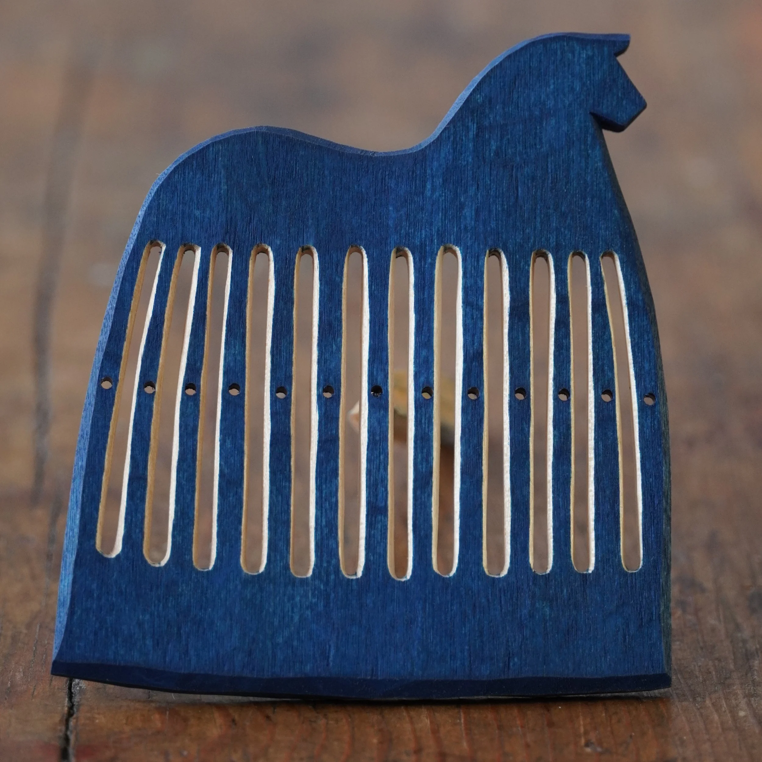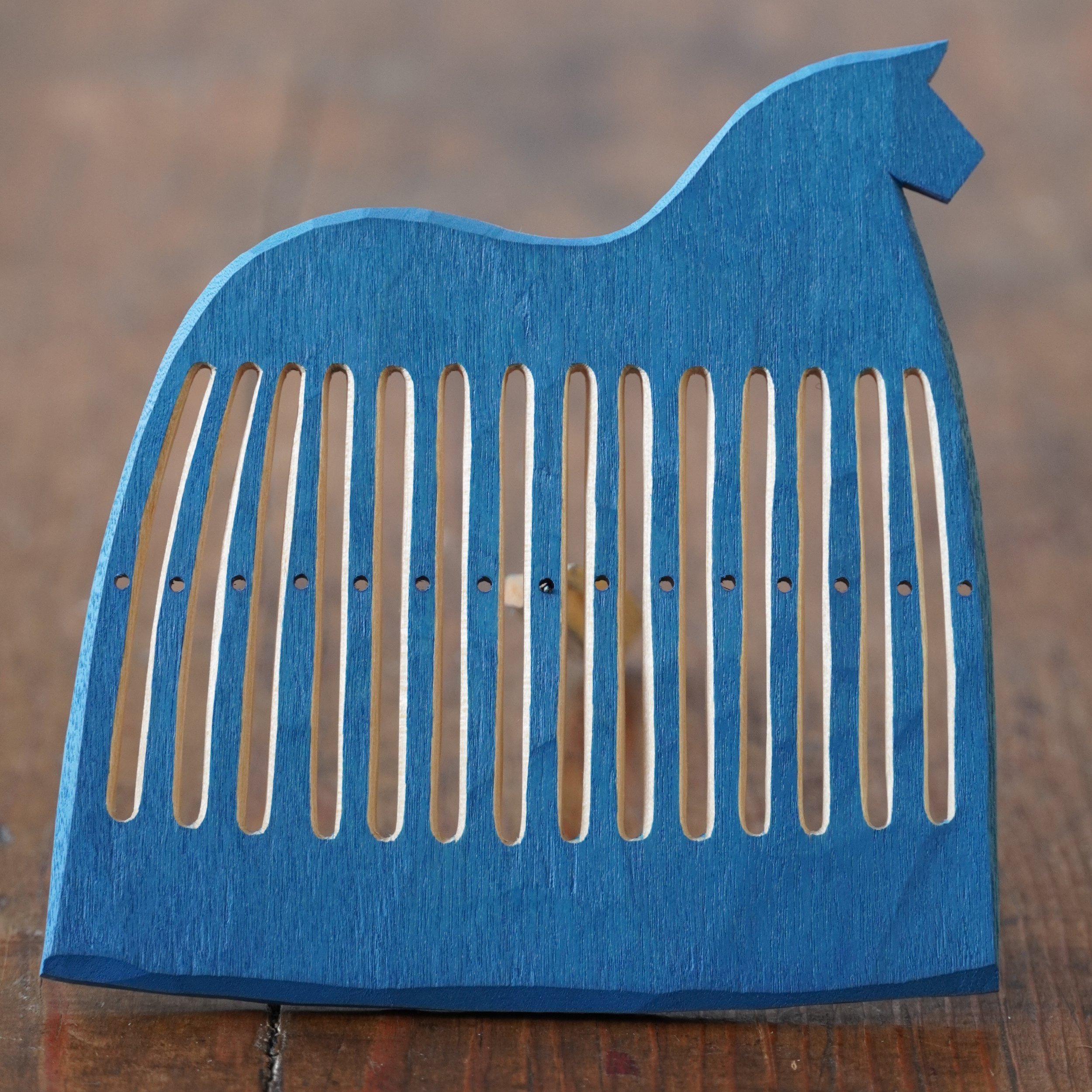It’s February and that means blue horse heddles! Last year I did a couple of horses that had their slits carved through the painted surface, leaving the slits unpainted. This requires very high concentration as you’re carving the slits, as any mistake will show up as a dent in the paint, but I also love the feeling of the knife cutting through the cured oil paint. It has a sense of performance: A “now-or-never“ moment. I decided to make the full set of horses in this style and I really enjoyed it, even if my first idea that it would be faster to make a set like this because the painting is much faster turned out to be all wrong: When every cut shows, carving is a lot slower. But now, at last, they are done and ready for you!