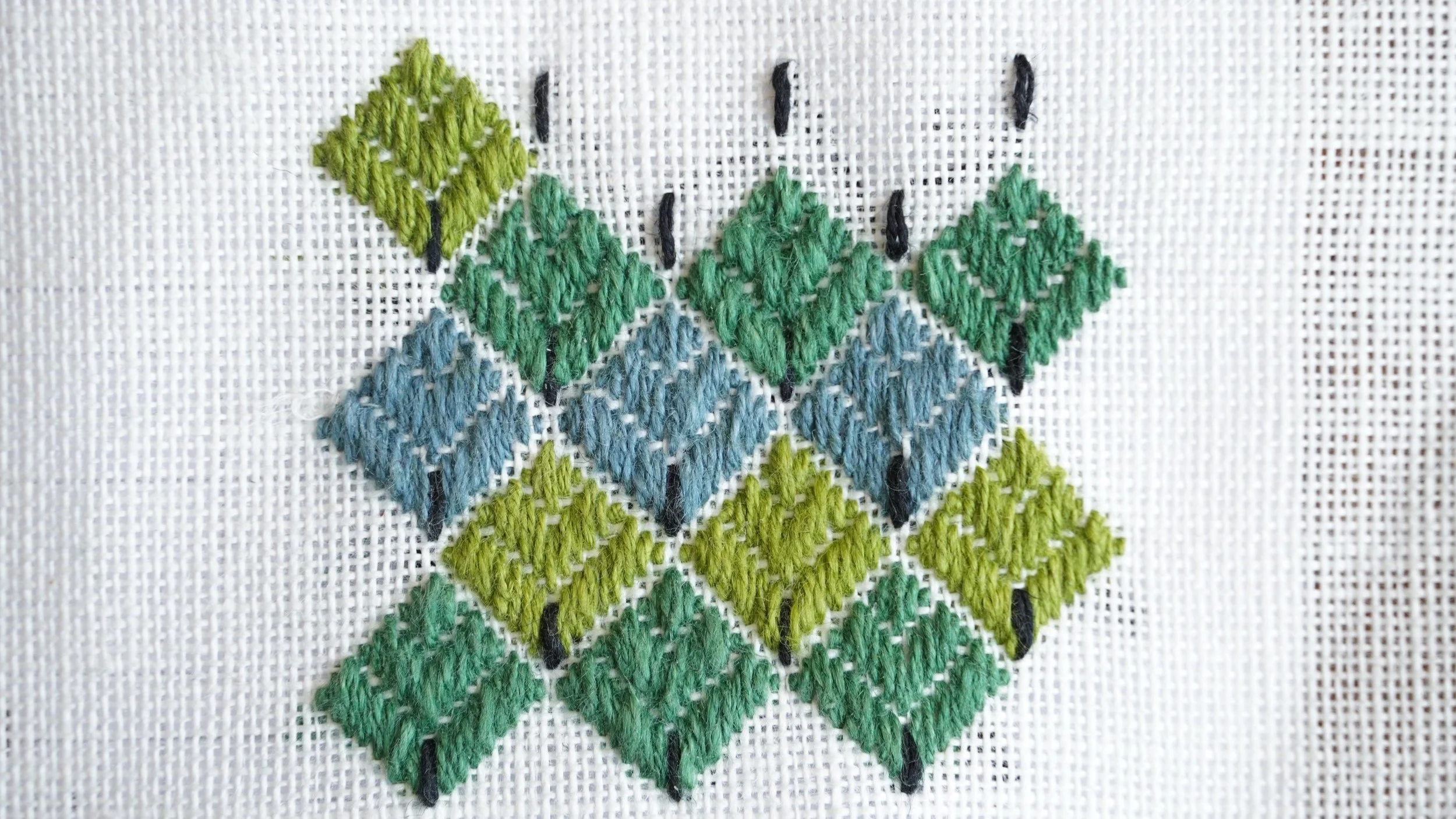 If you want to space out the leaves more you can leave five threads vertically and four horizontally, or as many as you like as long as you keep the horizontal number even and the vertical uneven. I think. That should just give you wider spaced leaves… But in truth I haven’t tried it, so please let me know if you do!