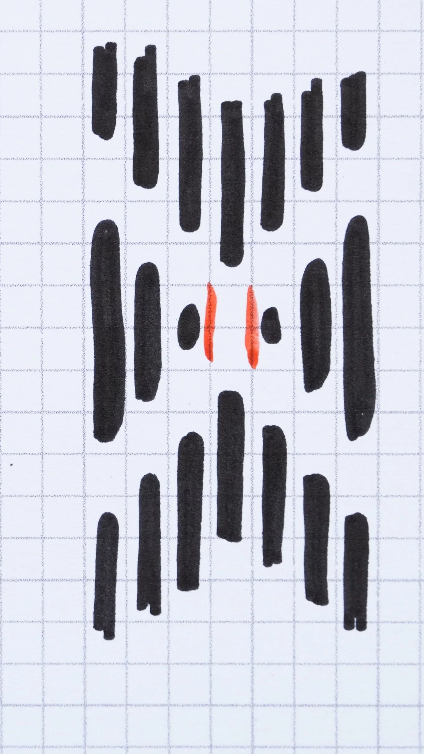 In this schematic every line of the grid paper is equivalent to a thread in the bottom fabric. The pattern consists of rows of vertical stitched that form little squares, placed next to each other. In every square I have made one stitch with a contrasting black thread to form the stem of a leaf.