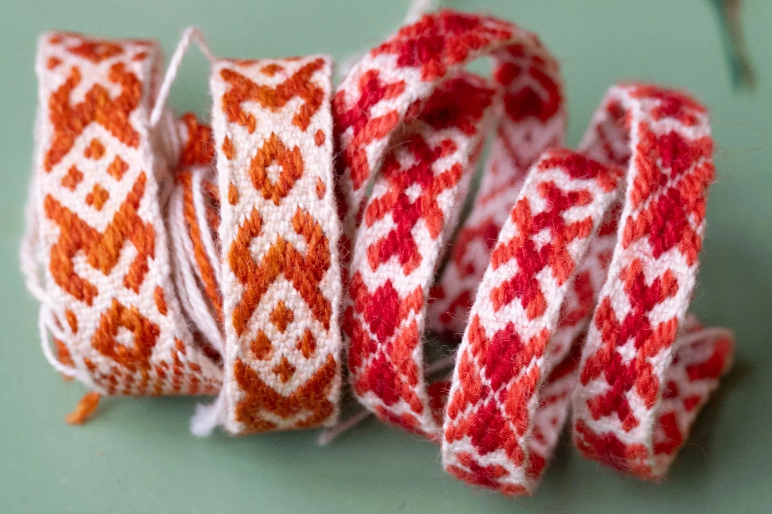 Learn how to weave pick-up patterned bands online with me! I’m arranging this class together with American Swedish Institute and they will be hosting us on zoom, where I will show you how to weave these advanced bands with step by step instructions. The class will be divided into two sessions of two hours each, with a little homework in between. You are required to know basic rapport band weaving to be able to fully participate in this class.
